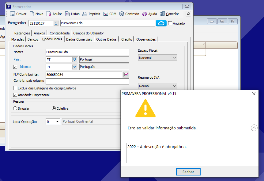 Boa tarde, A mensagem terá origem no indicado, uma conta do plano de contas sem descrição. O erro surge ao criar a entidade pois deverá ter a opçao de criação das contas no momento da gravação da entidade. Caso retire essa opçao, o fornecedor deverá ser criado sem erro. Valide o plano de contas: SELECT * FROM PlanoContas WHERE Descricao IS NULL Cumprimentos.