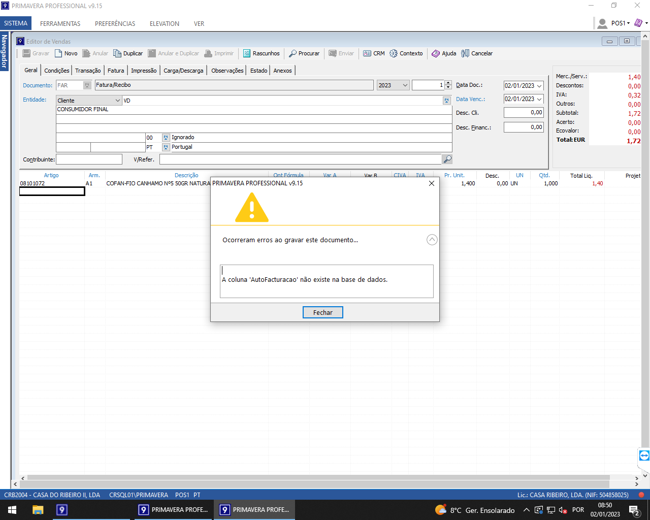 | ♥ 0 | Duplicada. This question already has an answer here: Gravar documentos com autoliquidação nas vendas de 2023 dá erro No POS ao gravar dá o seguinte erro: A coluna ‘AutoFacturacao’ não existe na base de dados Marked as spam |