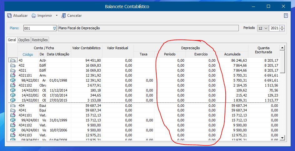 No balancete contabilístico na coluna relativa à Depreciação não está a ser preenchido qualquer dado (imagem em anexo) O que poderá estar a originar a situação?