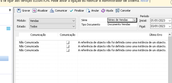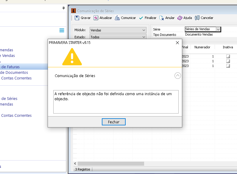 | ♥ 0 | Ao comunicar as séries de um cliente que tem starter v9, o programa devolve o seguinte erro: “A referência de objeto não foi definida como uma instância de um objeto” O cliente já se encontra na versão mais recente do programa, atualizado hoje dia 3/1/2023 Alguma solução?