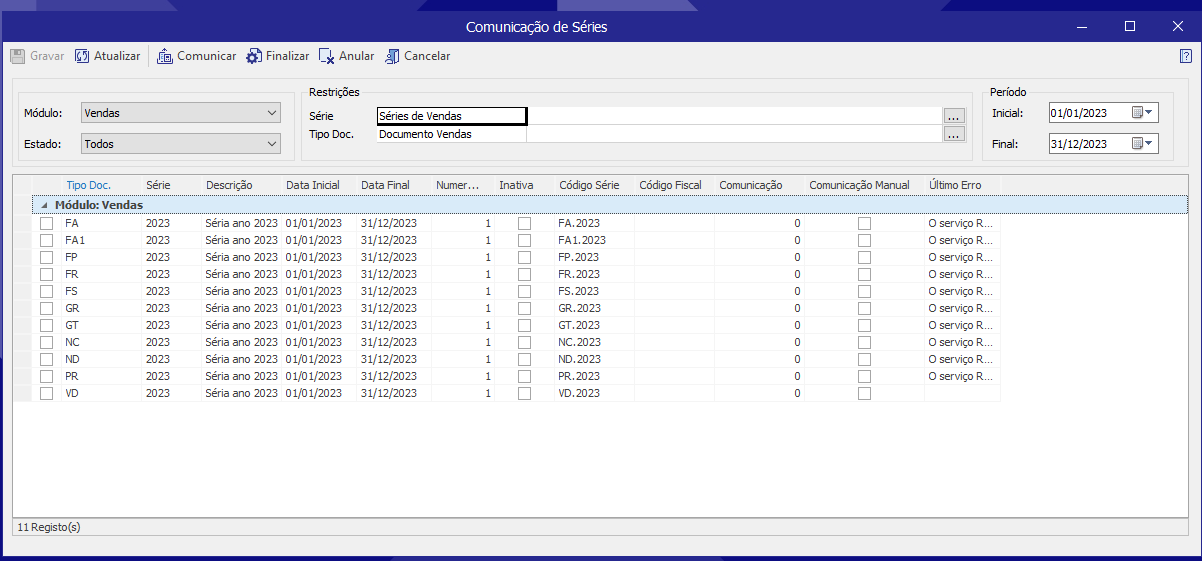 | ♥ 0 | Bom Dia Alguém já teve este erro na comunicação das series? Das empresas que estão nesta instância PRIMAVERA, só nesta acontece este erro. A comunicação foi feita usando as builds disponibilizadas ontem (19/12/2022). Marked as spam |