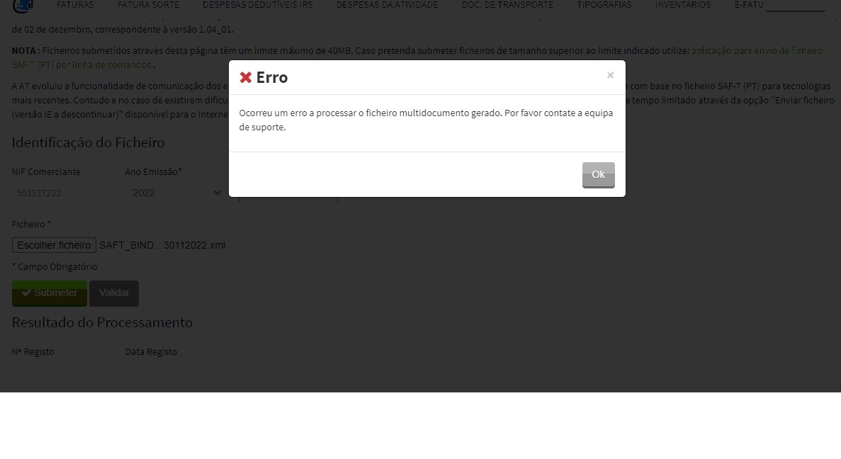 | Private answer Atendendo à mensagem de erro: "Ocorreu um erro a processar o ficheiro multidocumento gerado.", agradecemos que validem se nesse ficheiro todos os códigos ISO dos países usados no SAFT estão preenchidos. Antes de exportar o SAFT no ERP deve garantir que todos os países tem o código ISO preenchido. Temos conhecimento que se submeter o ficheiro a partir do IE, vai conseguir submete-lo, porque este conjunto de regras de validação não são validadas pelo portal da AT. Não recomendamos este contorno.