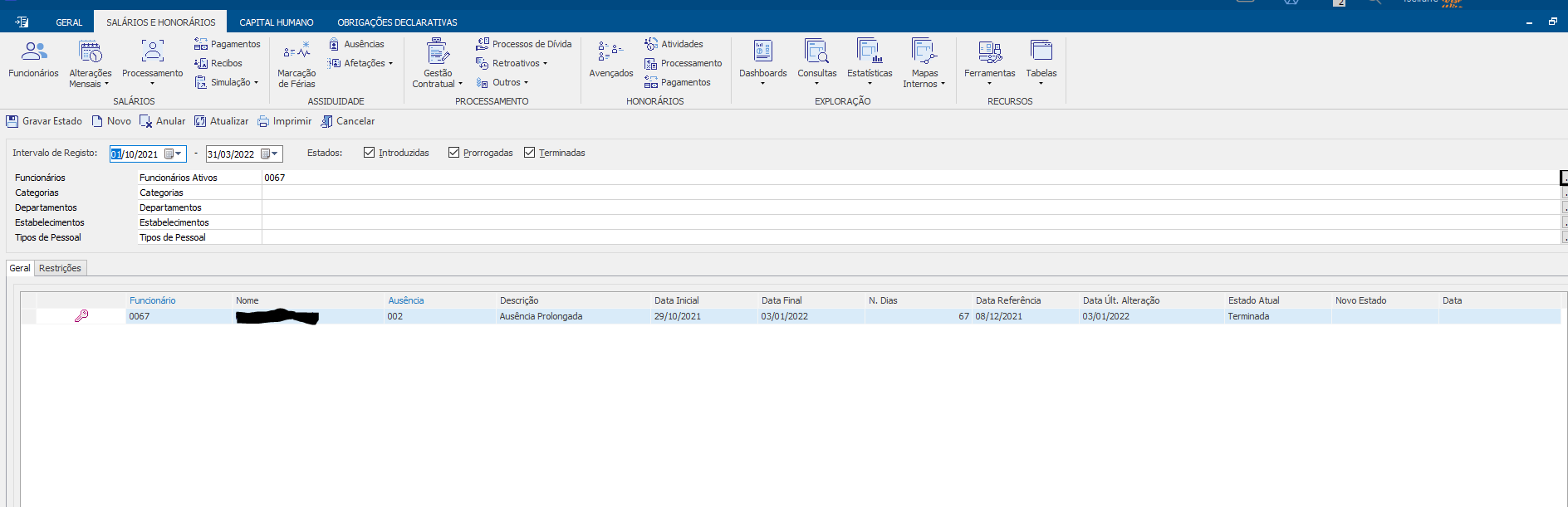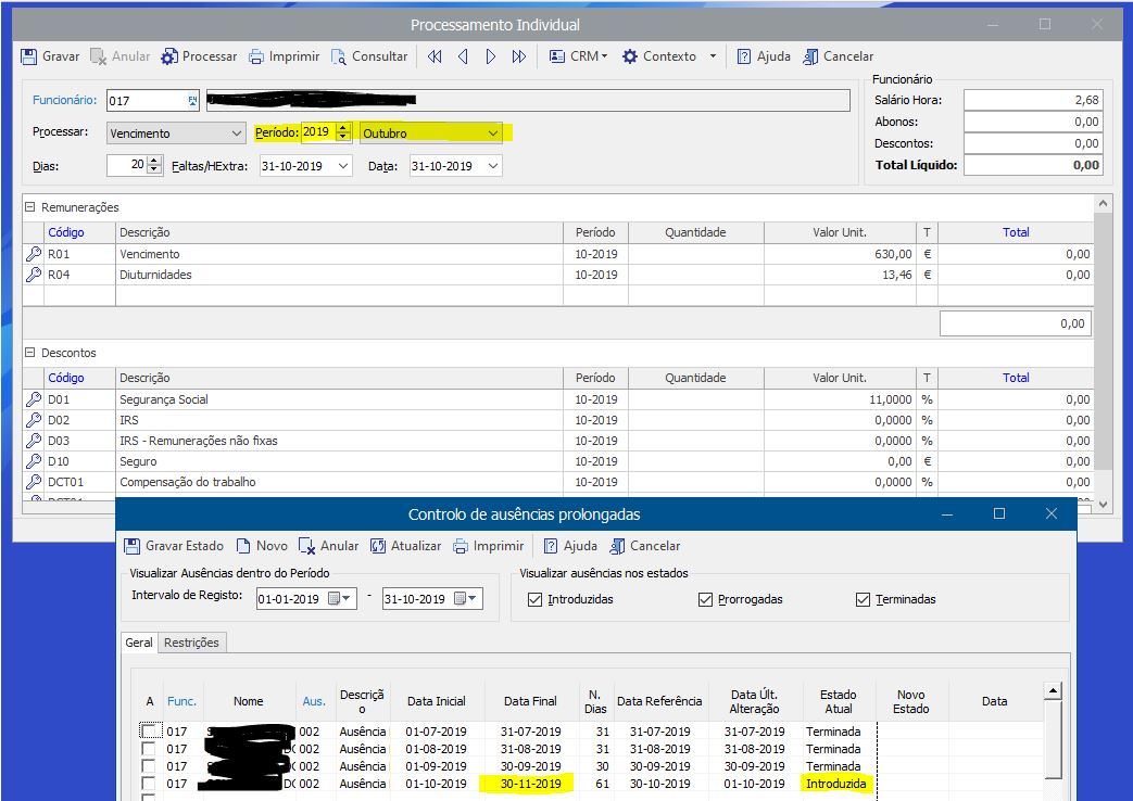| Private answer Bom dia, no controlo de ausências valide se o estado atual está como "Terminada" e não "Introduzida". Depois passar o estado para Terminada e validar a data final da ausência volte a processar.