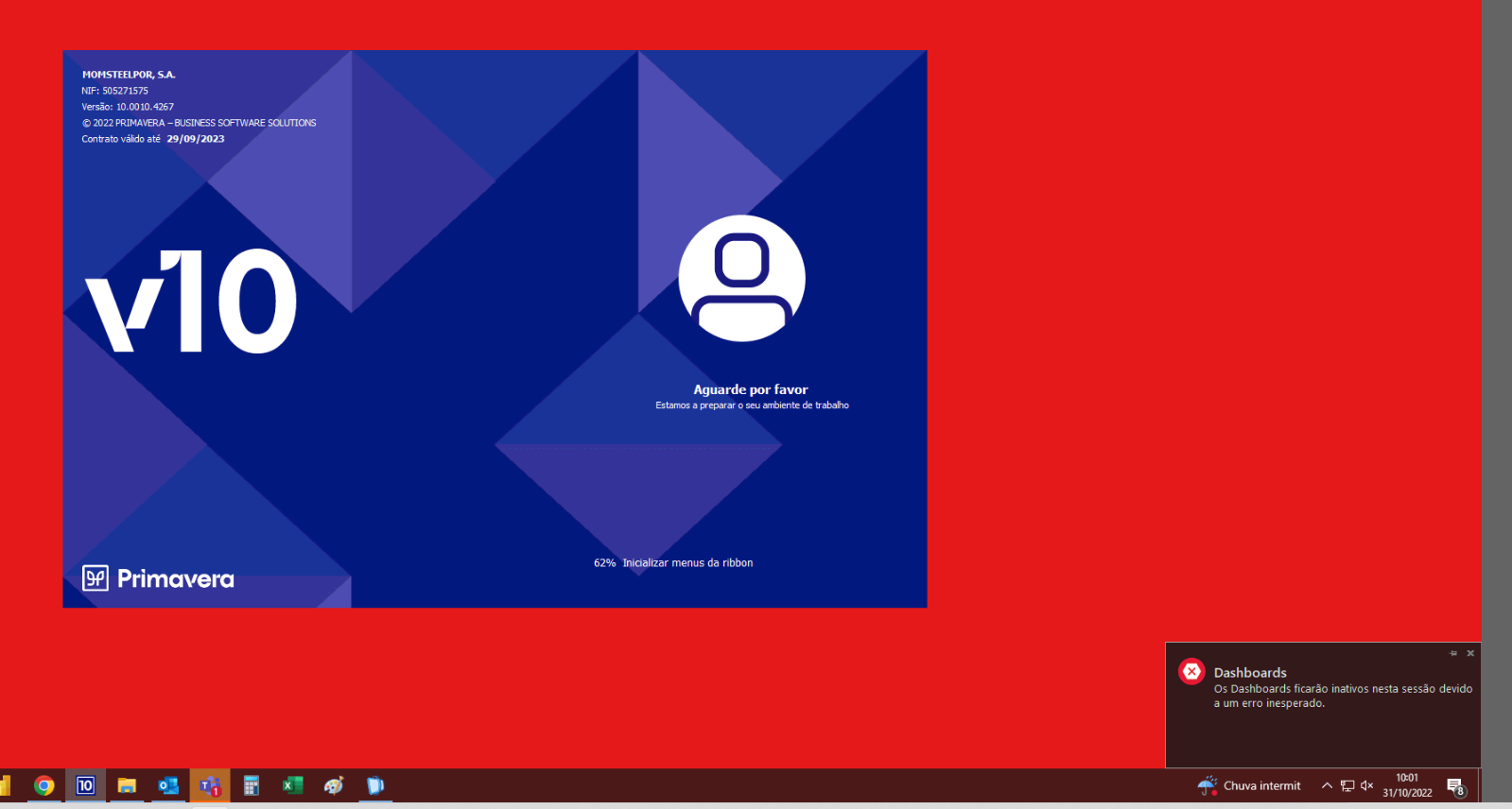 Em vários postos do cliente o Primavera chega aos 62% e ocorre Erro nos Dashboards – “Os Dashboards ficarão inativos nesta sessão devido a um erro inesperado”. O Primavera desliga-se e os computadores reiniciam automaticamente.