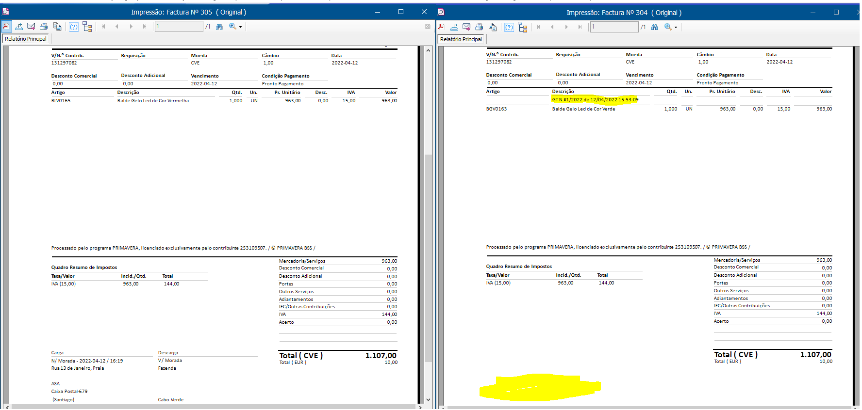 | Private answer Relativamente a esta cuestión, como debes imaginar, los mapas de sistema cumplen con todos los requisitos legales y fiscales de Cabo Verde. De referir que, aunque marquen la opción de "Transporte propia entidad" no aparece ninguna mención a eso en la impresión. Sobre lo de facturar directamente no hay ningún problema, si te fijas en el siguiente print, la factura que fue realizada por transformación de una GT no tiene los datos de Carga/descarga mientras que la factura que fue hecha directo si los tiene: Eso la aplicación lo hace inclusive en Portugal. Se considera que un documento Financiero también sirve de documento de transporte. Pero si el cliente da en falta de alguna información legal/fiscal en los documentos, hágannos llegar la información legal sobre ese tema. Marked as spam |