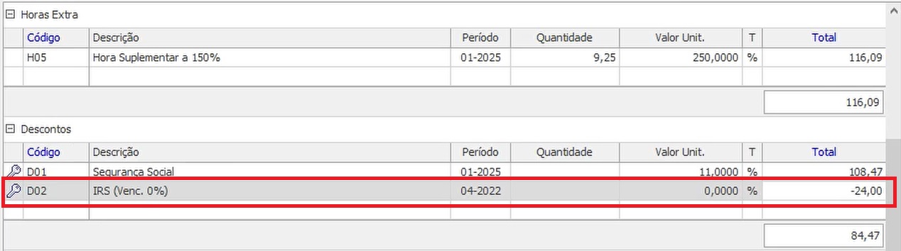 | ♥ 0 | Duplicada. This question already has an answer here: Processamento Salarial - Efectua Calculos Diferidos Boa tarde, Tenho um cliente que ao fazer o processamento de vencimento de Janeiro, um funcionário aparece com IRS de 2022 com um valor a negativo, conforme imagem. Como posso resolver este problema? Marked as spam |