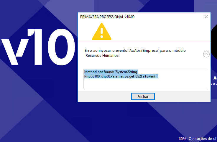 | Private answer Esse erro parece estar relacionado com isto: https://helpcenter.ila.cegid.com/v10/novidades/?news_id=169016 Actualizar / reparar a instalação dos módulos? Marked as spam Comments Depois de reparar o módulo do RH, o ERP abriu. Obrigado.