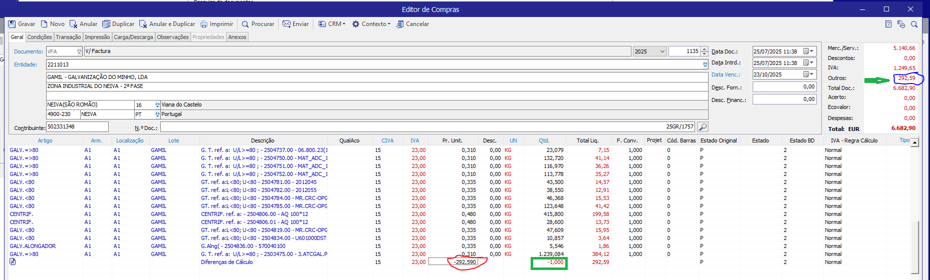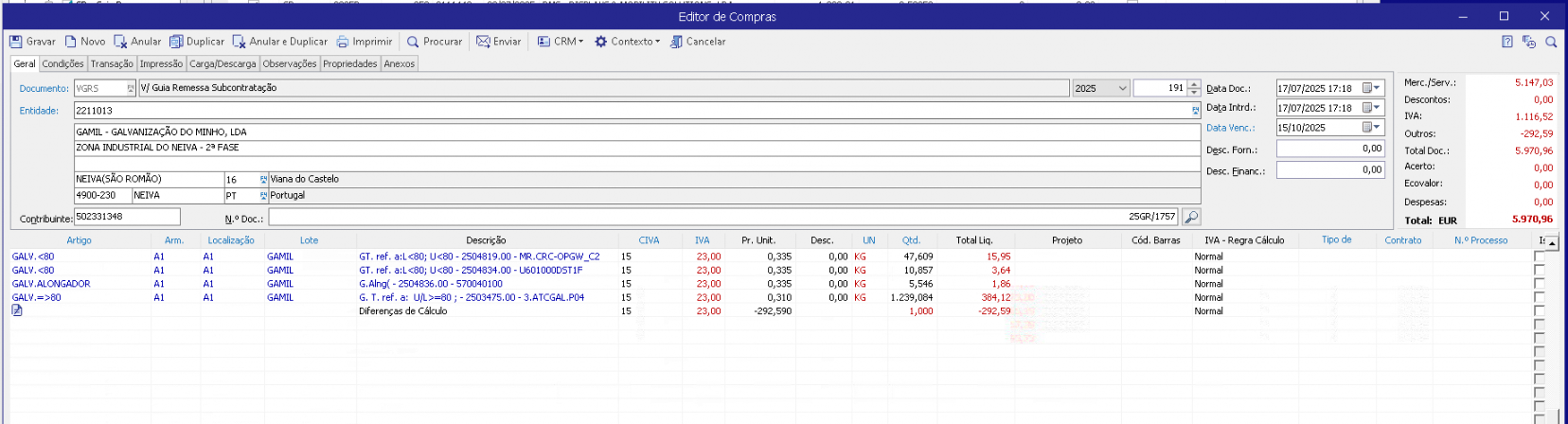 ♥ 0 | Viva. Depois de atualizar(24/07/2025) o ERP, ao transformar um VGR para uma VFA muda o sinal na quantidade apenas da linha “diferenças de Cálculo”, fazendo com que um acerto negativo se transforme em positivo. Nas VGR’s registadas antes da atualização e transformadas em VFA depois da atualização isso não acontece, apenas está a acontecer com os documentos registados depois da atualização. Na VGR o valor na quantidade está correto (ver anexos). Alguém tem solução? Obrigado. Marked as spam |