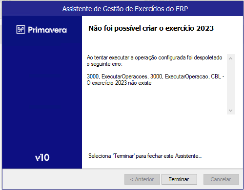 | ♥ 0 | Já é o terceiro cliente que não me permite criar o exercício 2023, utilizando o Assistente de Gestão de Exercícios do ERP. “Ao tentar executar a operação configurada foi despoletado o seguinte erro: 3000, ExecutarOperacoes, 3000, ExecutarOperacao, CBL – O exercício 2023 não existe” O erro ocorre em todos os clientes que tenham o módulo Contabilidade. Marked as spam |