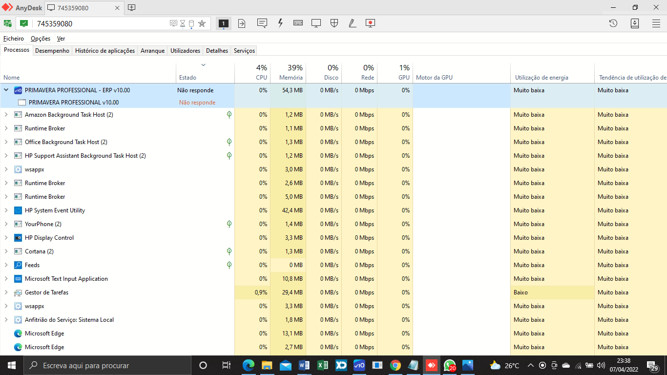 A situação ocorre nos postos, a aplicação abre sem gerar qualquer erro, mas passado poucos minutos o Primavera para de funcionar repentinamente, sem despoletar nenhuma mensagem de erro relacionada a falha de conexão com o Servidor e os utilizadores são obrigados a fechar a aplicação pelo Gestor de Tarefas do Windows 10/11, porque mesmo aguardando por algum tempo, a aplicação não dá nenhum sinal de execução.