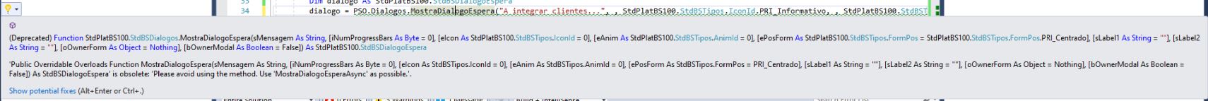 | Private answer Boa tarde Ricardo, Esta classe foi marcada como obsoleta após alguns dos métodos serem interpretados de forma ambígua em VB.NET, relativamente à passagem de parâmetros "ByRef". Dado que esta reorganização é uma alteração signiticativa de compatibilidade, optamos por duplicar o código e reorganizar numa nova classe "MensagensDialogos", ou seja, PSO.MensagensDialogos. Não existe uma intenção da nossa parte de apagar a classe original no futuro próximo, pelo que, ela poderá continuar a ser utilizada. Aconselhamos no entanto que substitua as invocações, sem qualquer pressão em termos de tempo, para "PSO.MensagensDialogos". Informamos ainda que, por lapso, esta nova classe não foi exposta no Interface público (StdPlatBS100.StdBSInterfPub) da plataforma, pelo que iremos encarar este incidente como anomalia e publicar até dia 10/03 uma correcção - 52982. Se o "PSO" em questão se referir ao StdPlatBS100.StdPlatBS, poderá fazer desde já a alteração referida acima. Obrigada Marked as spam |