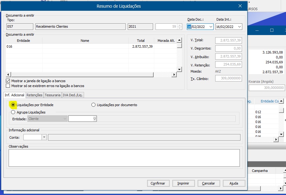 após confirmar o documento, no resumo de liquidações, separador Inf. Adicional, ative a liquidação por entidade e volte a tentar.
