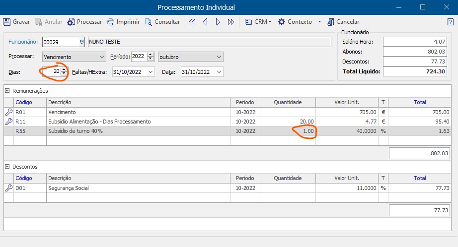 | ♥ 0 | Bom dia, Tenho um caso de um funcionário que recebe 40% do valor hora do numero de dias úteis, sabem-me dizer se consigo configurar um codigo para isso. Automáticamente ele chama o código coloca 40% do valor hora mas na quantidade não me coloca os dias úteis como mostro na imagem. Muito obrigado Marked as spam |